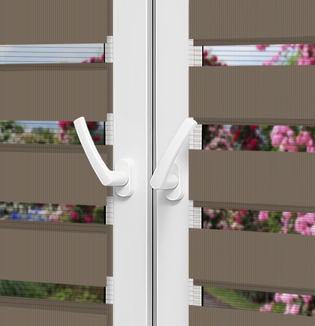 Задерживает от 30 до 80% света. Цвет: темно-коричневый (RAL 7006). Ширина полос: ткань 7.5 см, сетка 5 см.