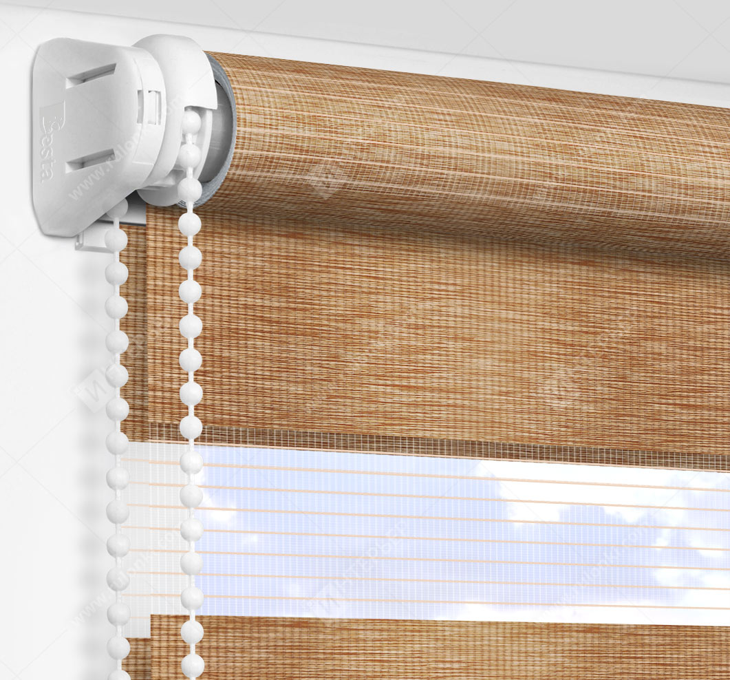 Рулонные шторы Зебра работают следующим образом: полоски ткани смещаются так, чтобы совпали светлые или темные слои, образуя, плотное или более прозрачное полотно. Так обеспечивается ночной или дневной режим затемнения. Также можно поднять шторное полотно полностью, открывая окно. По умолчанию - цвет фурнитуры белый.